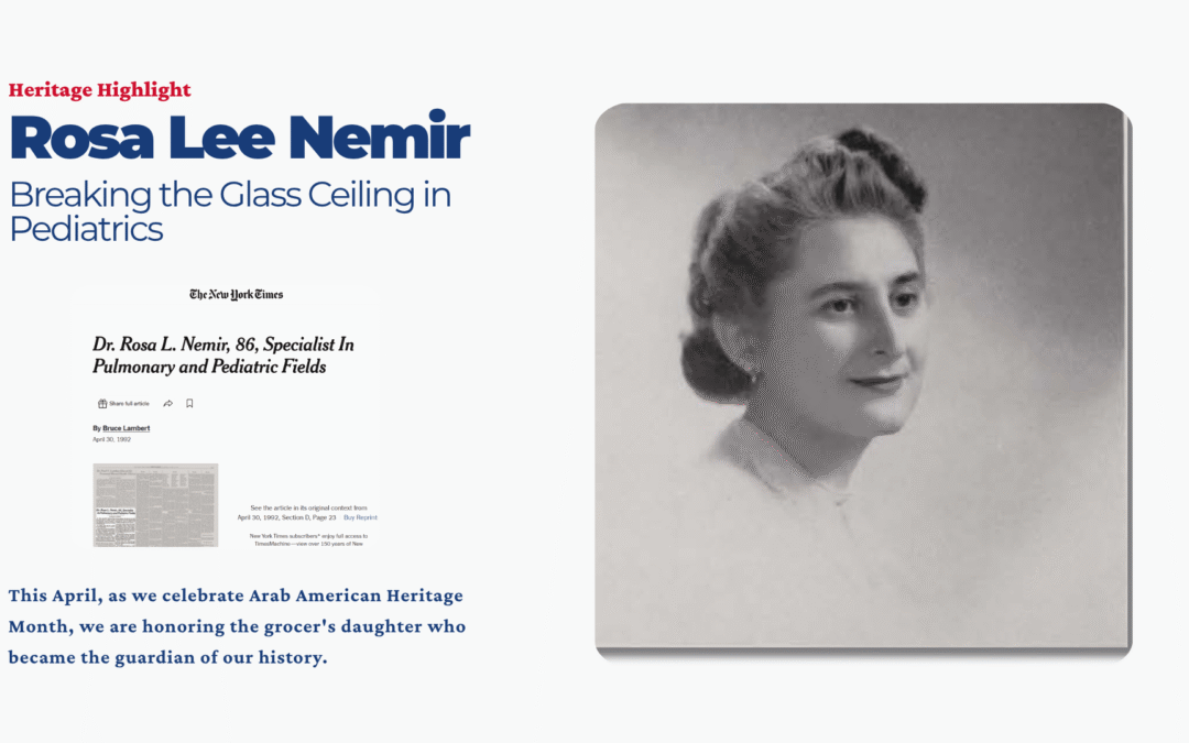 This April, as we celebrate Arab American Heritage Month, the American Task Force on Lebanon (ATFL) is proud to continue our "Heritage Highlights" series. This initiative is dedicated to reclaiming and celebrating the stories of Lebanese-Americans who have left an indelible mark on the fabric of our nation. Following our highlight of Dr. Alixa Naff, we turn our attention to another extraordinary pioneer: Dr. Rosa Lee Nemir.